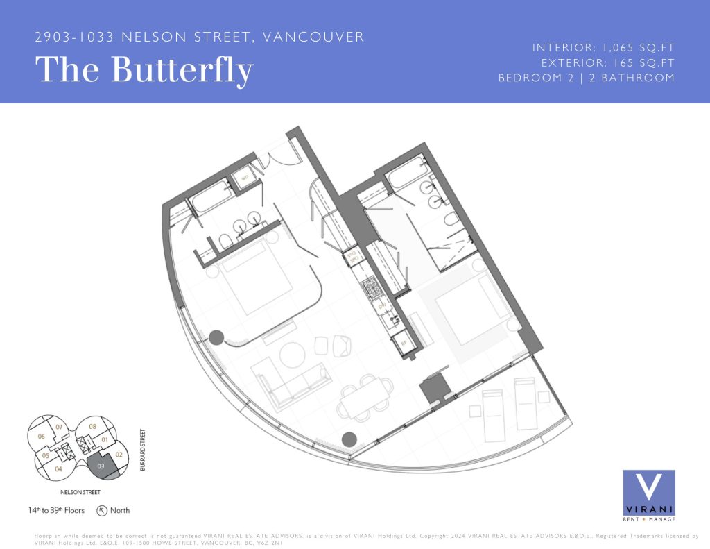 The Butterfly, a striking new addition to downtown Vancouver’s skyline. This world-class building features 331 one-of-a-kind homes. This BRAND NEW 2-bedroom, 2-bathroom unit on 29th floor with 1,065 sq. ft. of interior living and 1,250 Sq. Ft. of total living space offers a luxury living in one of the iconic buildings in Vancouver. The custom interior includes a eucalyptus veneered front door, large white porcelain flooring, and an Italian-crafted kitchen with Miele appliances. Floor-to-ceiling sheer drapery and curved glass walls enhance the light-filled space. LEED Gold certified, the building excels in energy efficiency and water conservation. Amenities include a 24-hour concierge, sky spa pool, gym, and a $1 million Fazioli piano. 1 Parking Stall, 1 Storage, 1 Bicycle Storage.
